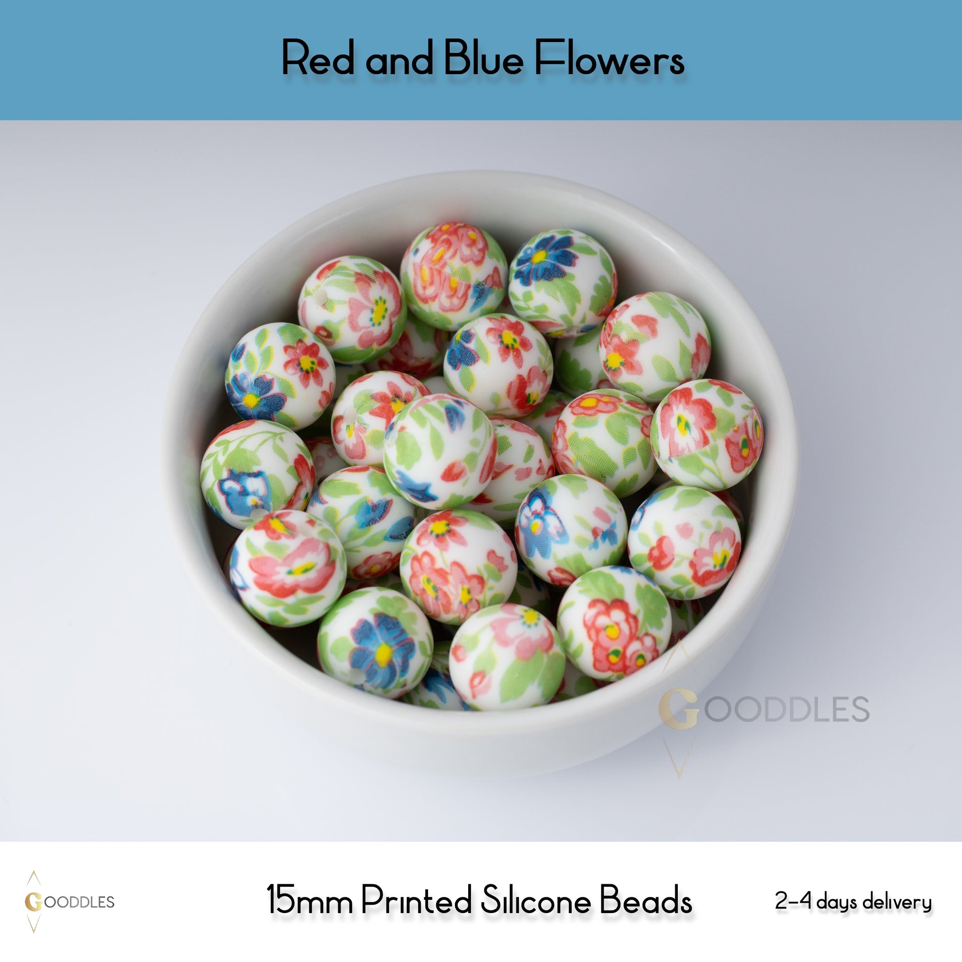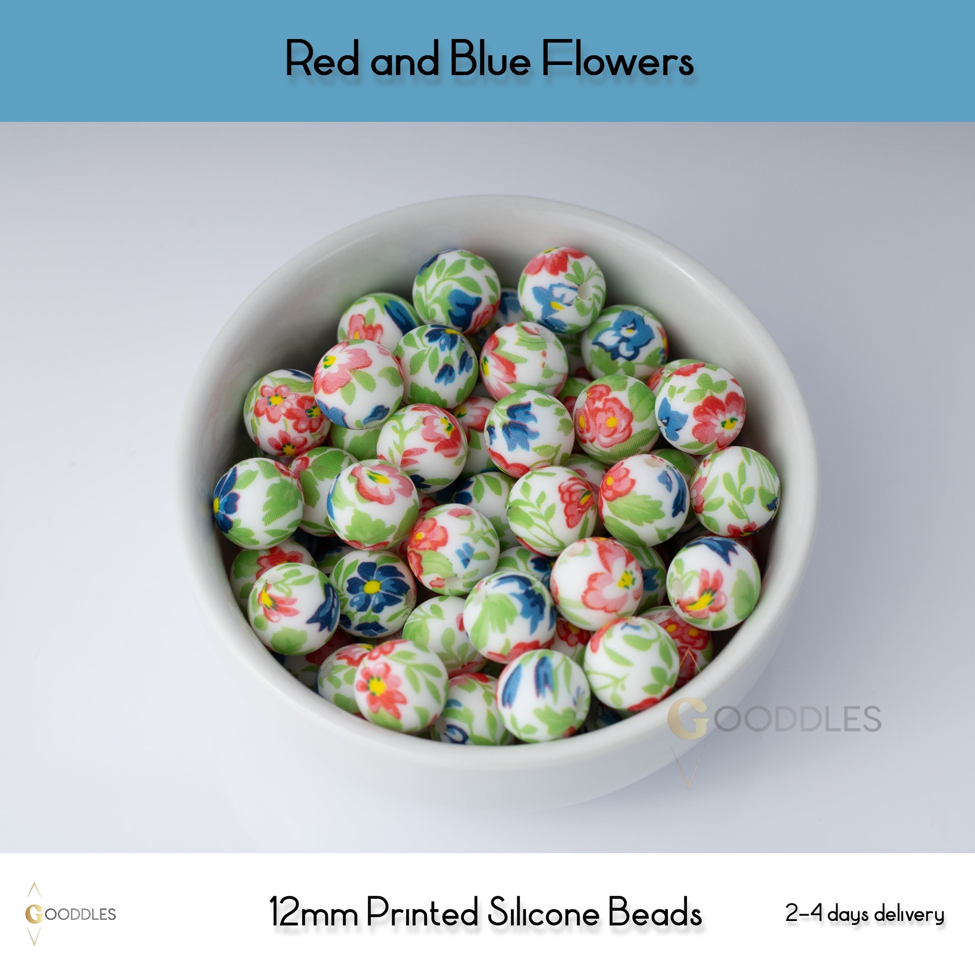 ★ Name : Round Printed Silicone Beads - Red and Blue Flowers